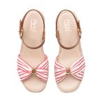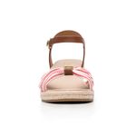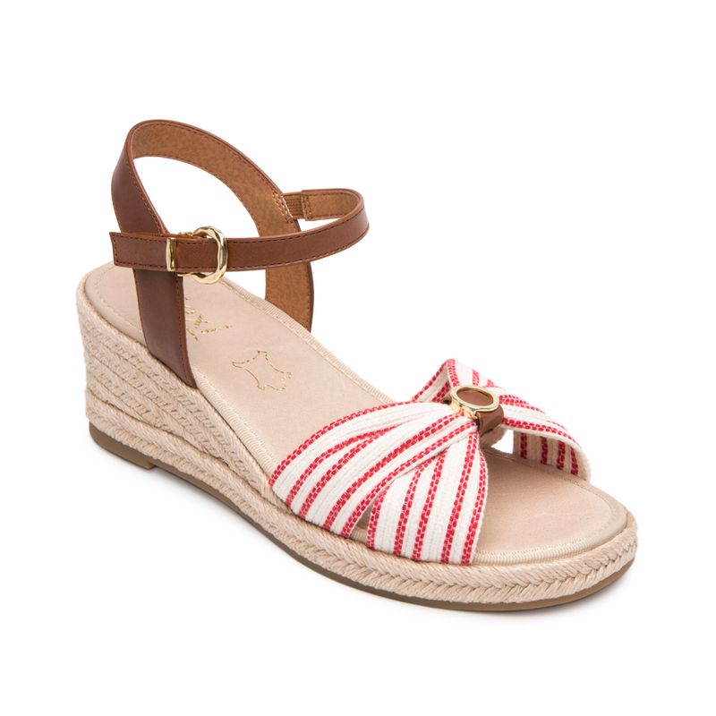 Sandalia con cuña baja de yute, con dos estilos: uno con un textil a rayas con un aire náutico y el otro con tiras multicolores que los hacen fáciles de combinar, son perfectos para llevar esta temporada.